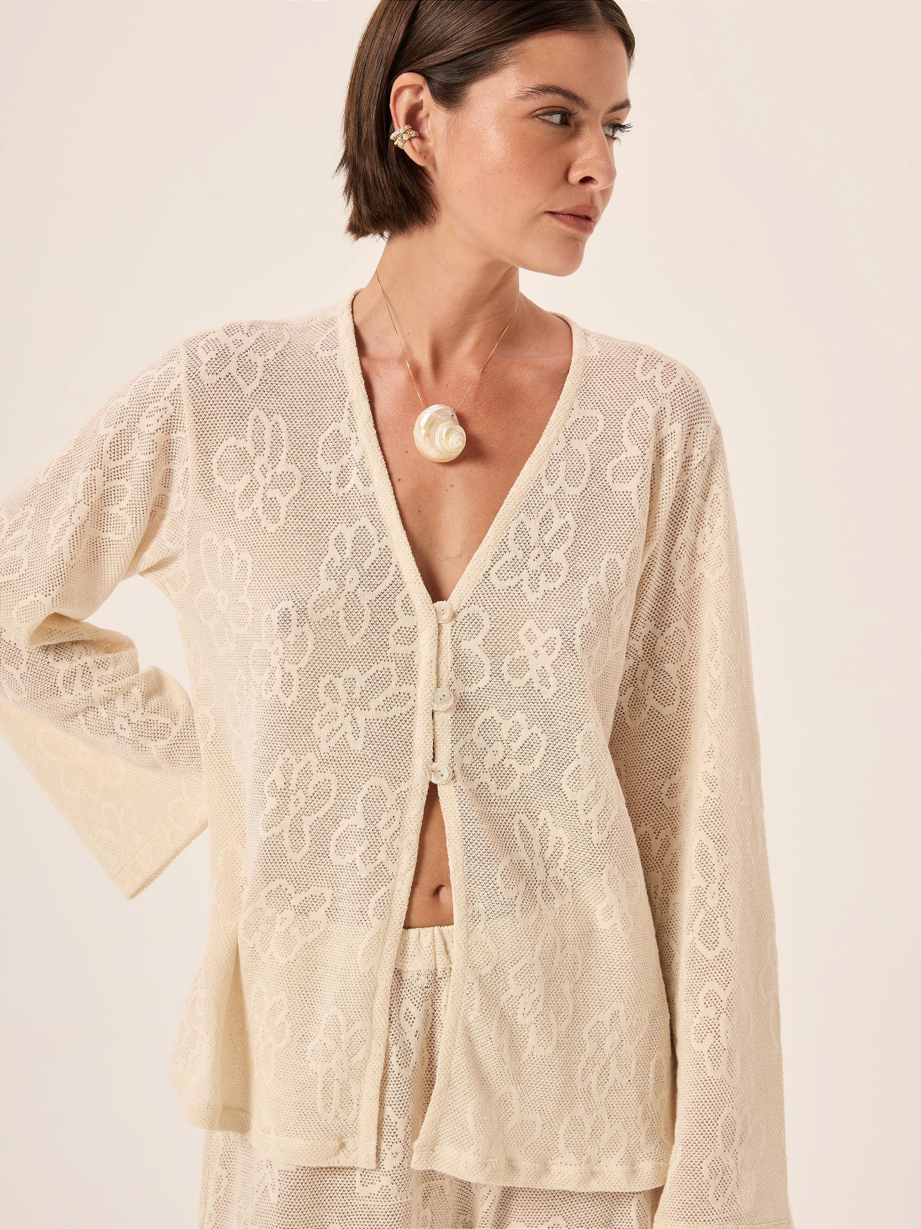 Leve, fluida e cheia de frescor. A Blusa Bag Frescor tem shape solto, mangas amplas e fechamento frontal delicado, criando um visual natural e elegante. Confeccionada em tecido texturizado com transparência sutil e desenho floral, é perfeita para sobrepor, usar aberta ou fechada, acompanhando o ritmo dos dias quentes com conforto e estilo.