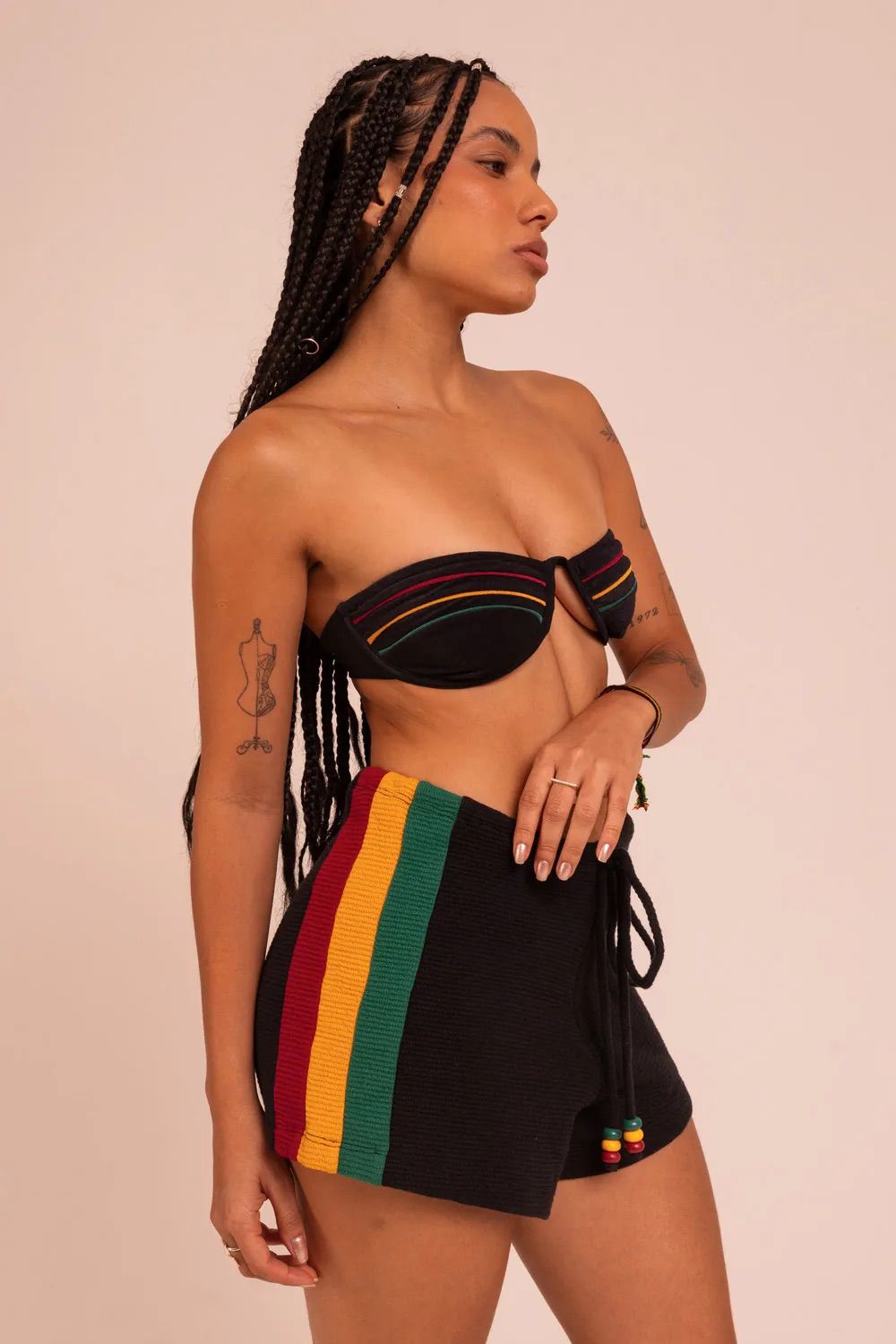 O Short Zion Reggae traz uma pegada vibrante e descontraída, inspirada na energia das cores e do ritmo reggae. Confeccionado em tricô texturizado, o modelo apresenta base preta com listras laterais em verde, amarelo e vermelho, e cintura ajustável por amarração com ponteiras de miçangas coloridas.